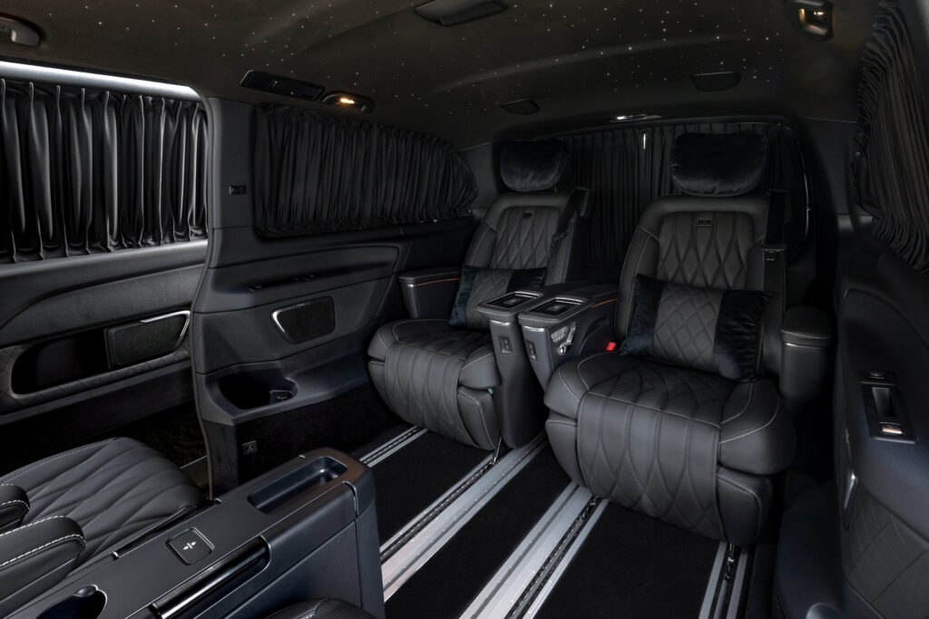 Abgedunkelte Materialien, hochwertige Vorhänge und ein fein integrierter Sternenhimmel schaffen einen geschützten Raum, der Privatsphäre auf höchstem Niveau bietet. Hier zählt nicht Aufmerksamkeit, sondern Ruhe – ideal für vertrauliche Gespräche, konzentriertes Arbeiten oder entspannte Fahrten abseits der Außenwelt.